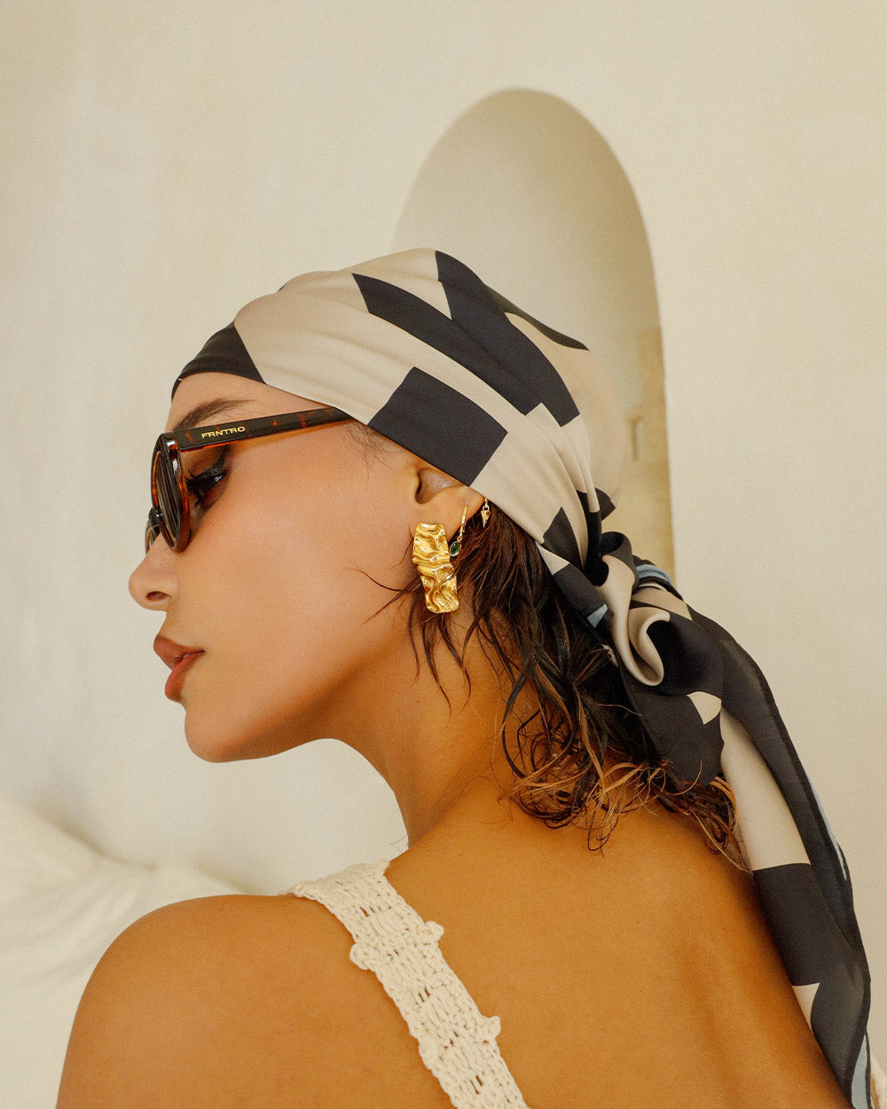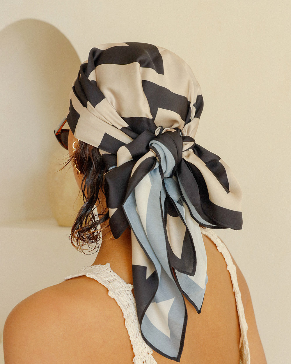 Our Brand Wrap is a versatile summer accessory. Crafted from Satin Chiffon and printed in our 'FR01' print, it can be worn as a headscarf, sarong, top or simply knotted around your neck or hair.